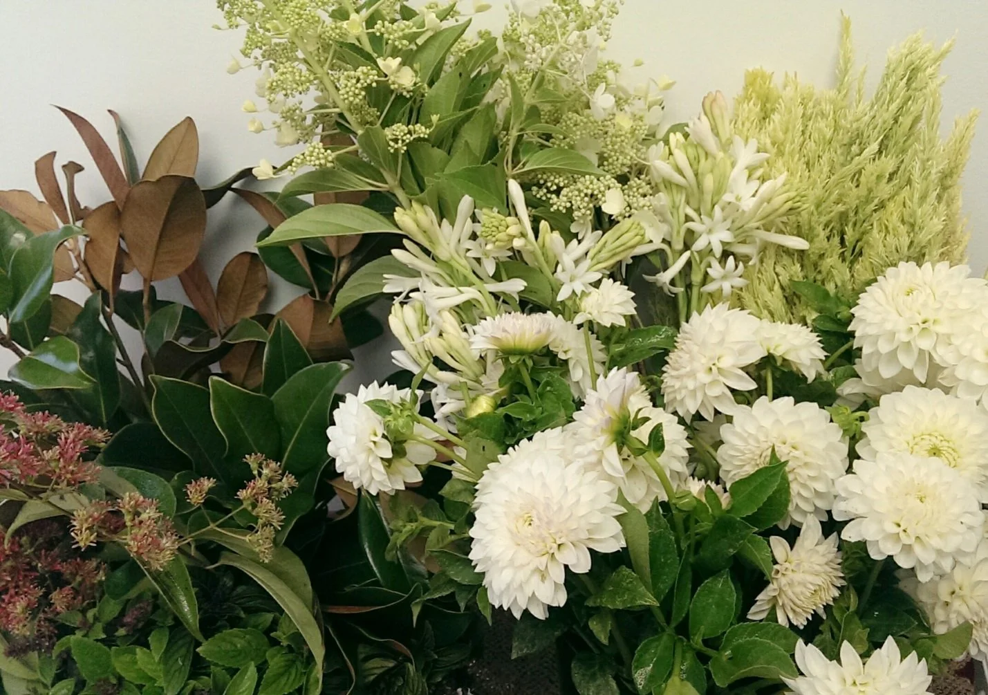 Dahlias, tuberoses, heptacodium, basil, celosia, hydrangea and magnolia foliage from Greenstone Fields.