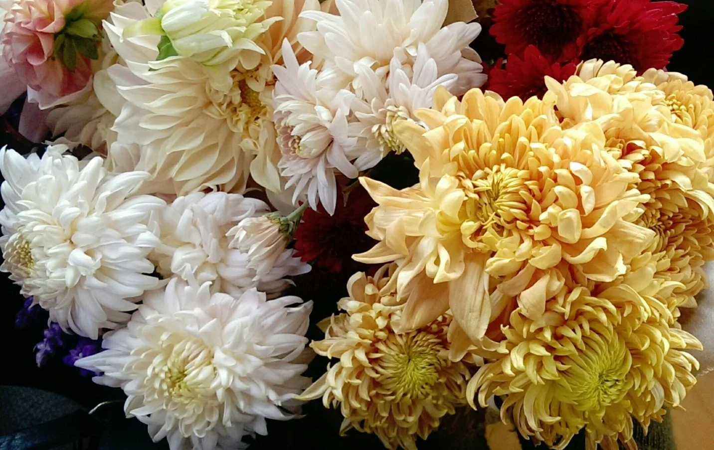 Local flowers from Wollam Gardens including toad lily, zinnia (limelight), dahlias, pee-gee hydrangeas, amaranth, celosia, cotinus (smokebush).